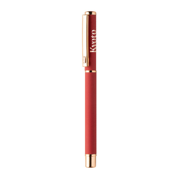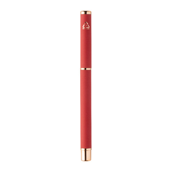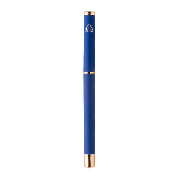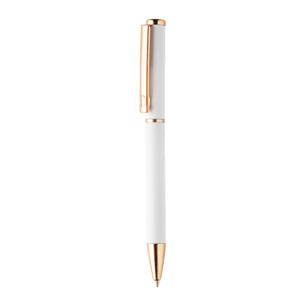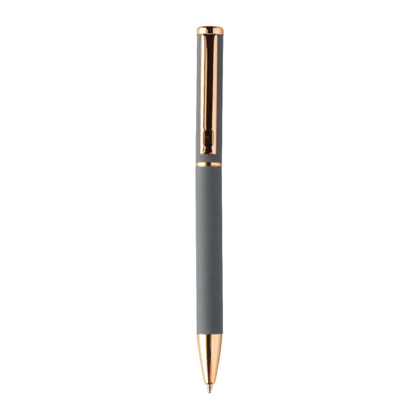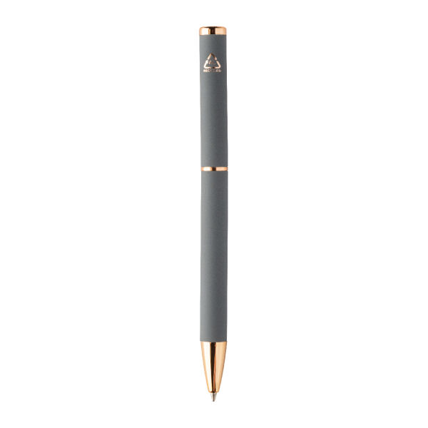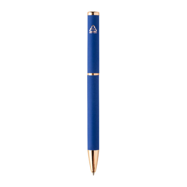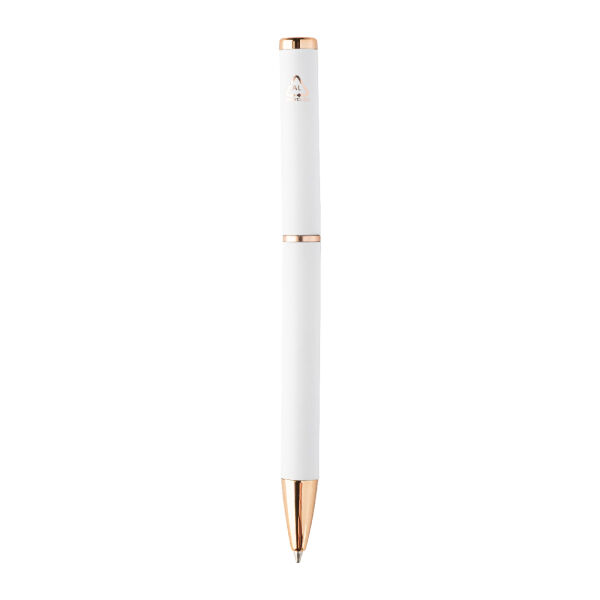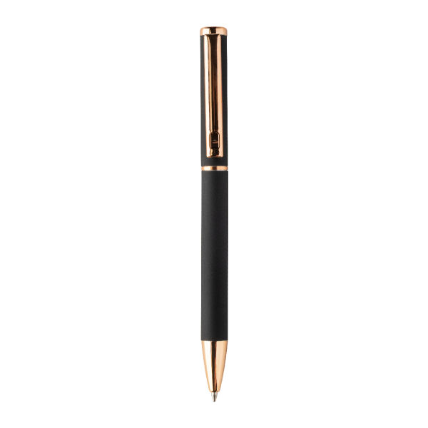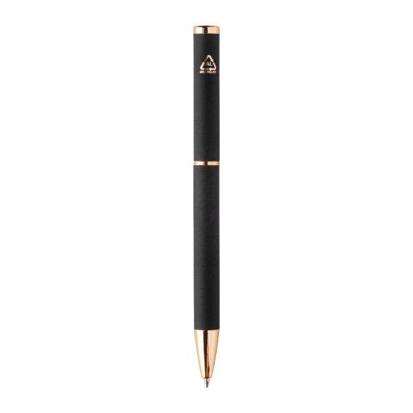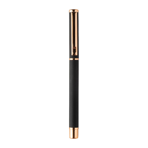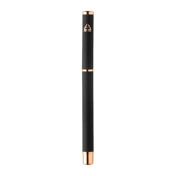 Recycled aluminium pen set with ballpoint pen and roller pen with rubberized finish and rose gold details. With blue refill. With special coating for mirror laser engraving in rose gold colour. In black paper gift box.