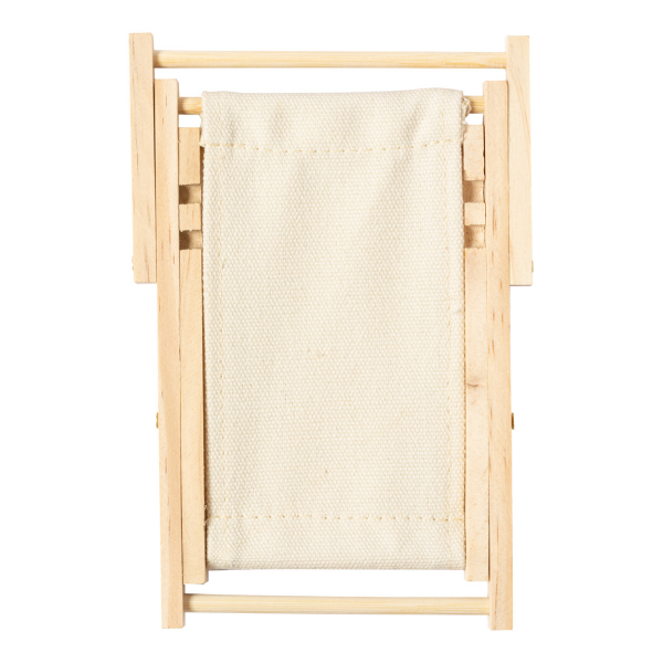 Opvouwbare mobiele telefoonhouder in de vorm van een ligstoel van hout en katoen.