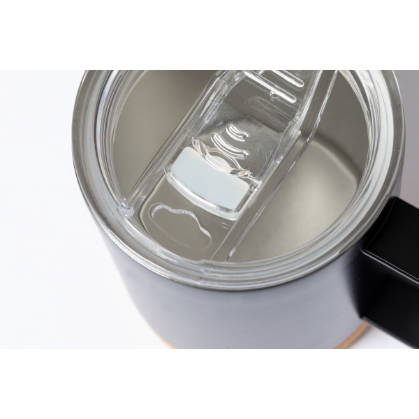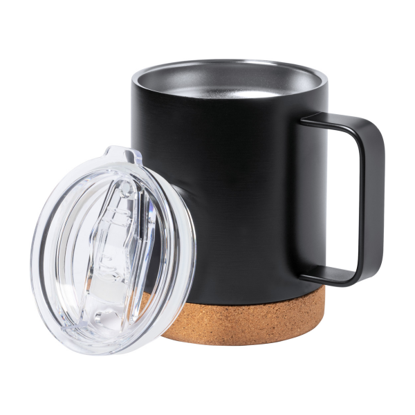 Dubbelwandige roestvrijstalen thermomok met drinkdeksel en bodem van natuurkurk, 330 ml. In kraftpapier doos.