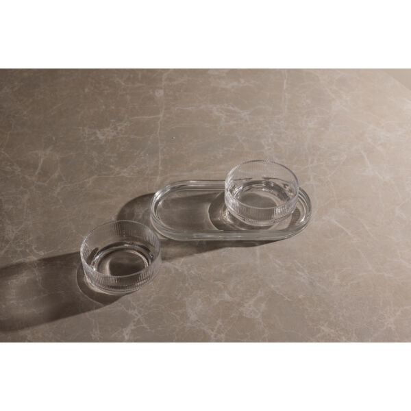 Een tapasset met een tijdloos design en klassieke, strakke lijnen. Perfect voor elke gelegenheid waarop je kleine gerechten, snacks of andere bijgerechten in stijl en elegantie wilt serveren.De set bestaat uit twee schaaltjes en een serveerschaal, die samen of afzonderlijk gebruikt kunnen worden. Gemaakt van sodalimeglas. De schaaltjes hebben een inhoud van 250 ml. Vaatwasmachinebestendig.
