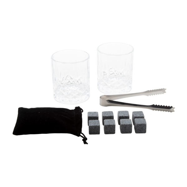 Luxe whiskyset in bamboe geschenkdoos. Inclusief 2 whiskyglazen (250 ml), 8 herbruikbare stenen ijsblokjes met opbergzakje en roestvrijstalen tang.