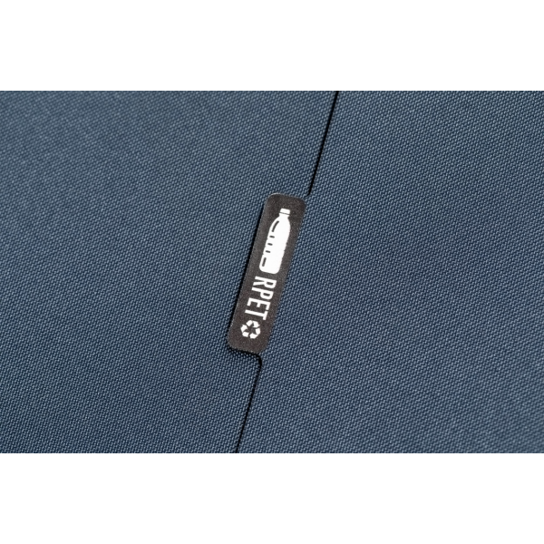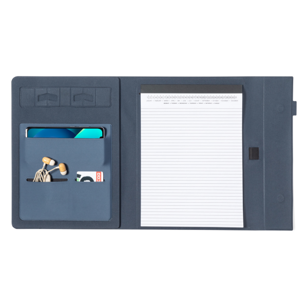 A4-formaat, 600D RPET polyester documentenmap met magneetsluiting, opvouwbare mobiele houder en notitieblok voor 20 gelinieerde vellen. Met onderscheidend RPET-label.