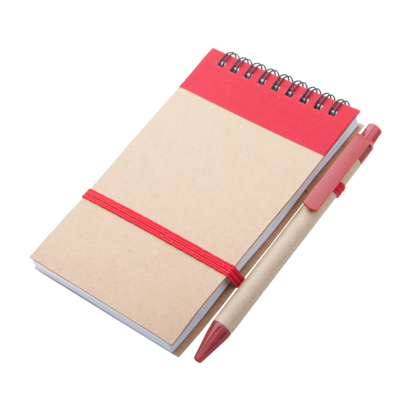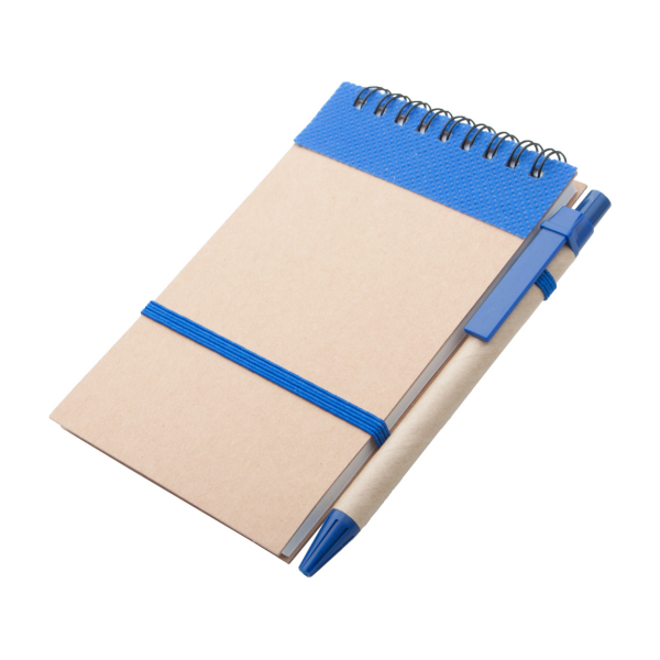 Notitieblokje met 70 blaadjes van gerecycled papier incl. balpen van gerecycled karton. A6-formaat.
