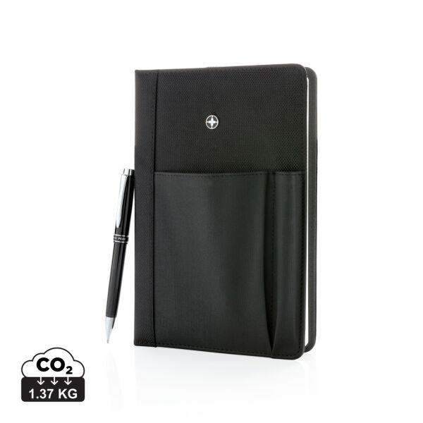 De hervulbare notitieboek en pen set is de perfecte keuze voor professionals die stijl en functionaliteit combineren. Het stevige omslag van 1680D en 600D polyester bevat een vervangbaar A5 notitieboek met 192 pagina’s van 80g/m² papier, ideaal voor notities, ideeën of aantekeningen. Het voorvak op de omslag biedt ruimte voor een pen, visitekaartjes, contant geld of je mobiele telefoon, zodat je alles georganiseerd bij de hand hebt. Het notitieboek en pen set wordt geleverd in een luxe Swiss Peak geschenkverpakking, wat het ook een perfect cadeau maakt voor zakelijke relaties of speciale gelegenheden.