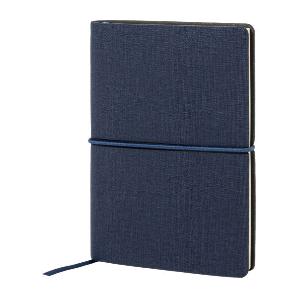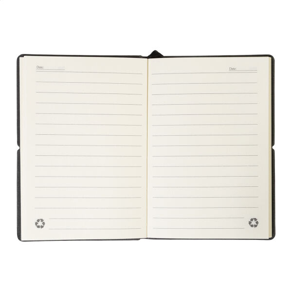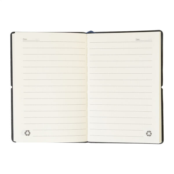 Gerecycleerd PU-leer bedekt notitieboekje met 70 gevoerde vellen in gerecycled papier, 25 notes en 125 pagina-markers (in 5 verschillende kleuren). Met bladwijzer en horizontale rubberen band. A6 grootte.