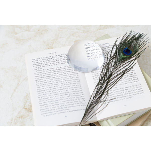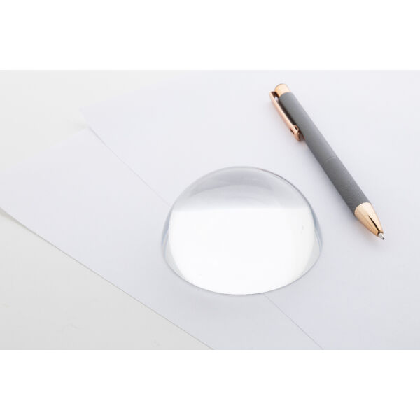 Glaskoepel presse-papier en loep. In zwart papieren geschenkdoos met fluwelen inleg en magnetische sluiting.