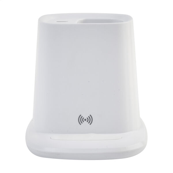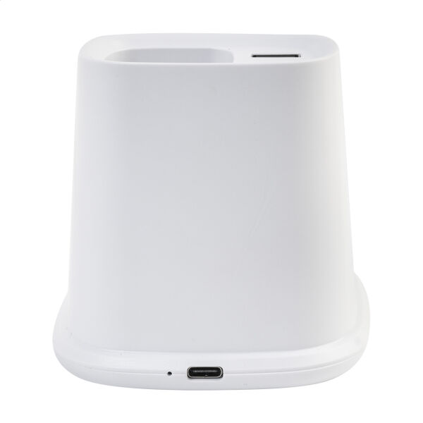 Gerecycleerde ABS multifunctionele bureaupenhouder met mobiele telefoon houder, ingebouwde draadloze snellader (10W), 1 USB en 1 USB-C opladerpoort. Inclusief USB lader kabel.