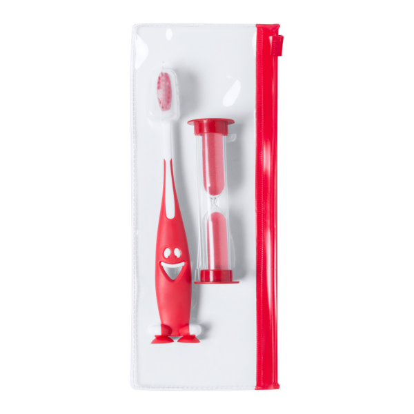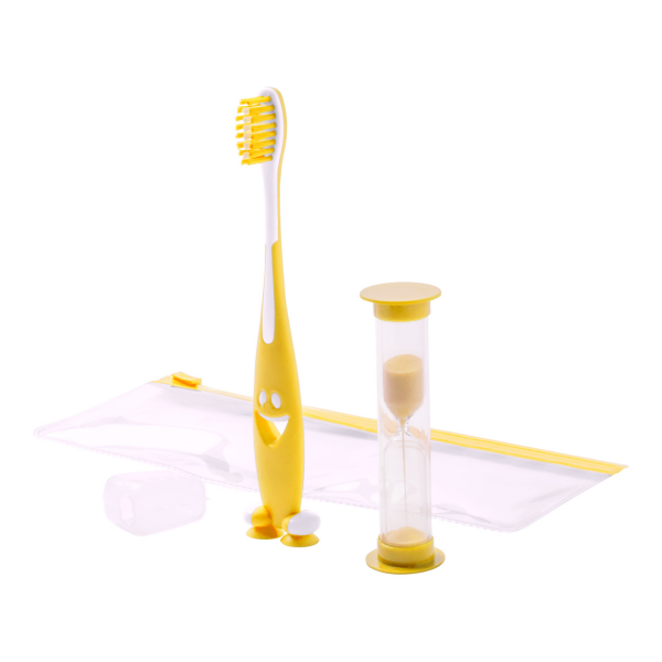 Tandenborstel set voor kinderen met plastic tandenborstel en zandloper. Plastic zak met rits.