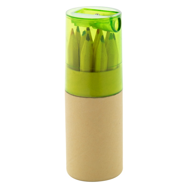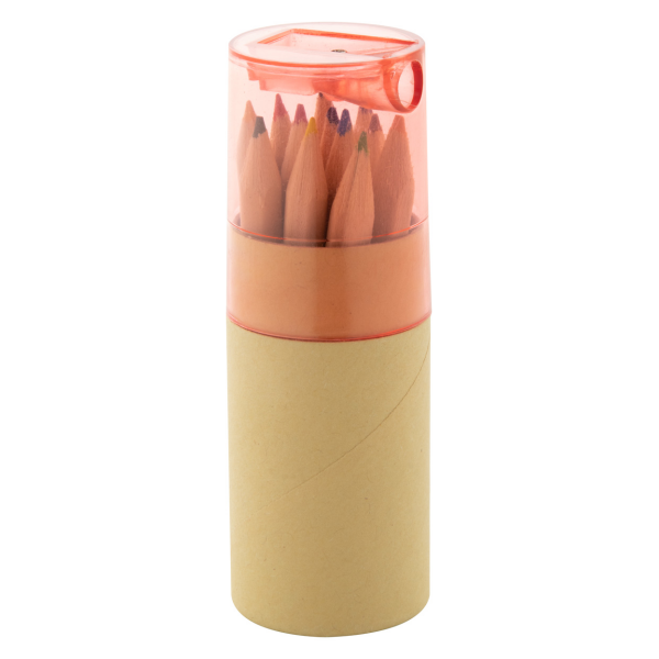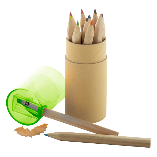 12-delige kleurpotloodset in ronde kartonnen koker met plastic puntenslijper.