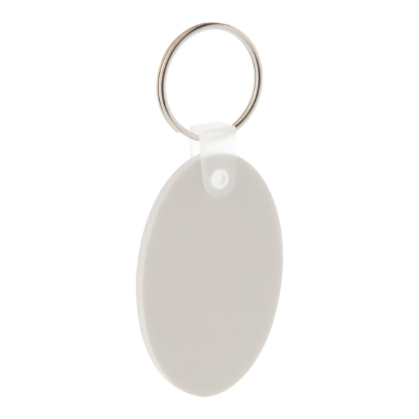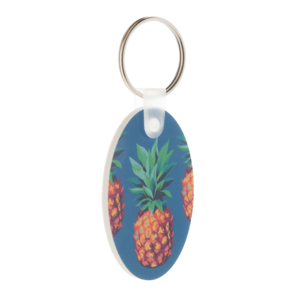 Ovale sleutelhanger van PVC-schuim met full colour bedrukking. Prijs is inclusief UV-bedrukking. MOQ: 200 stks.