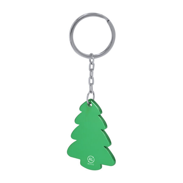 Kerstboomvormige sleutelhanger van gerecycled aluminium met metalen ring.