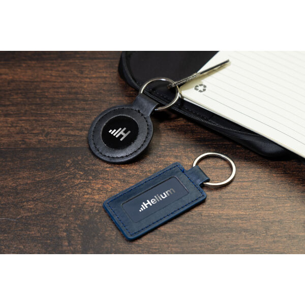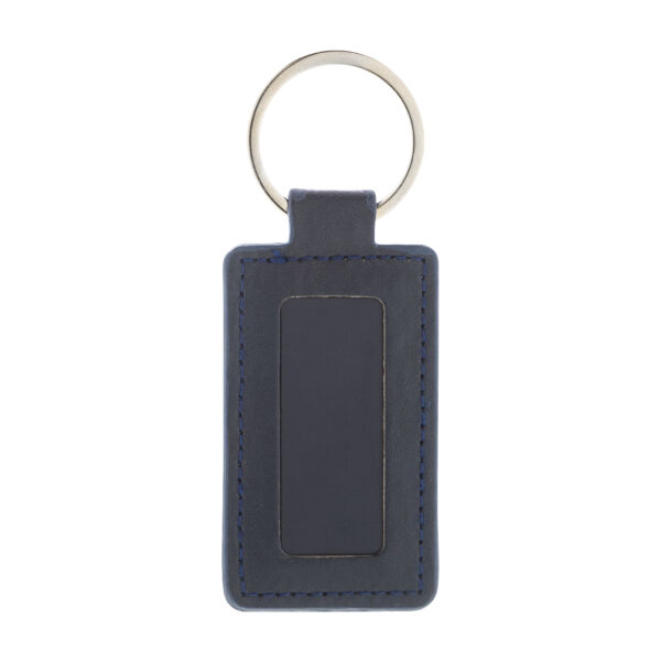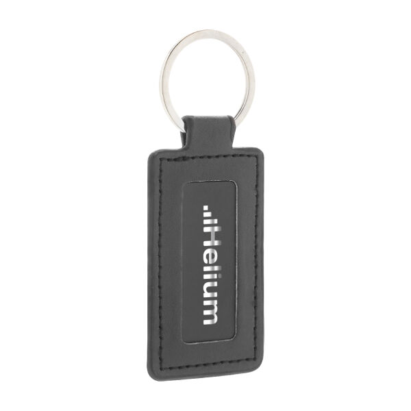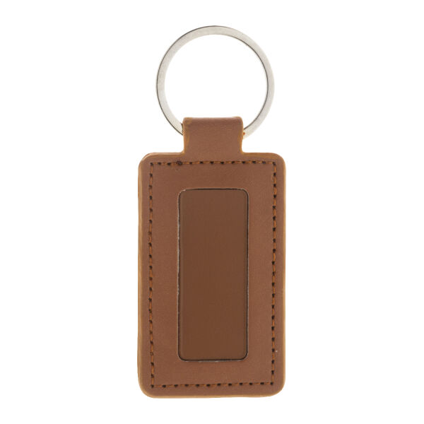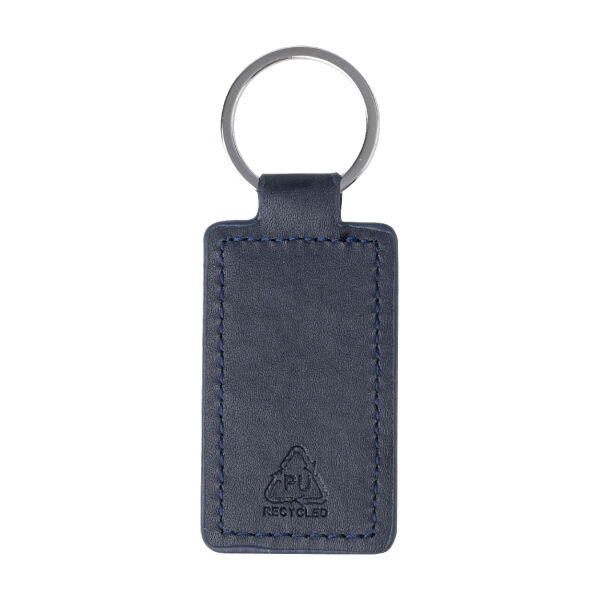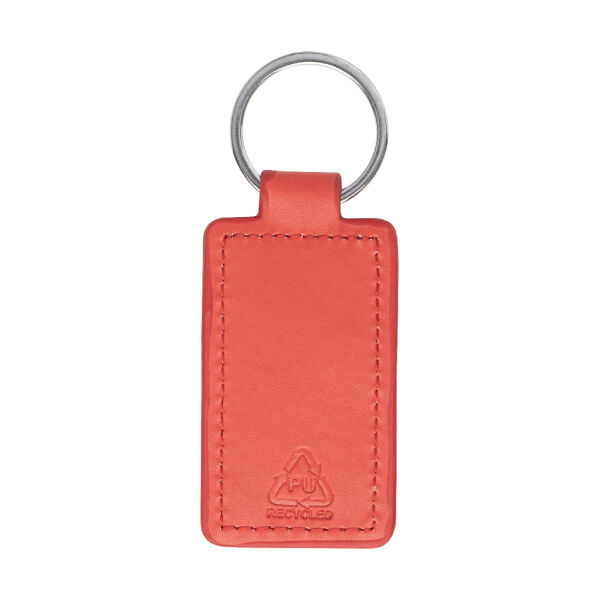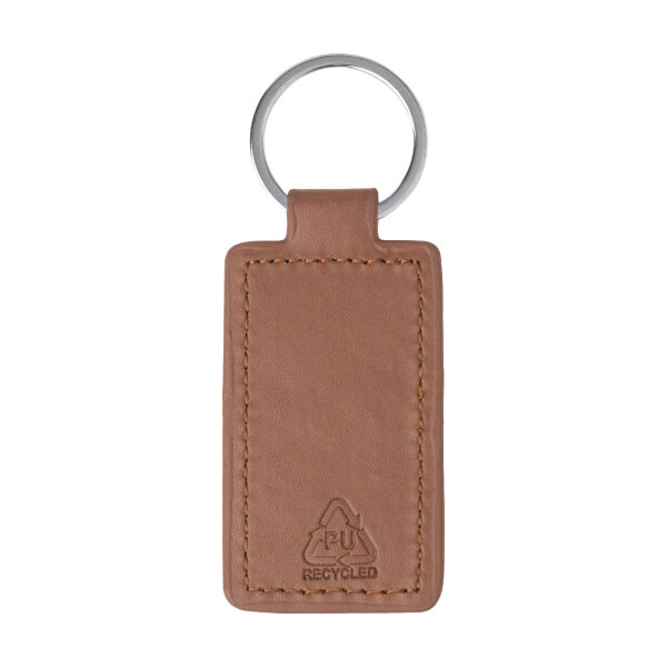 Rechthoekvormige, gerecyclede PU-leren sleutelhanger met metalen ring en roestvrijstalen logoplaat met rubberen afwerking. Met speciale coating voor spiegellasergraveren.