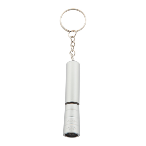 Kunststof, mini zaklamp met 1 LED, metalen afwerking en metalen sleutelhanger. Met knoopcelbatterij.