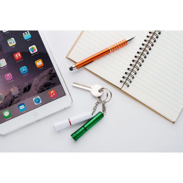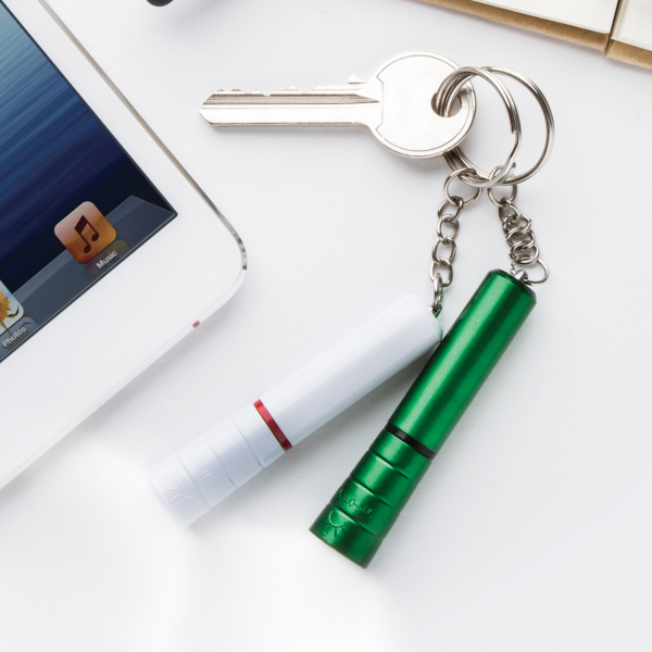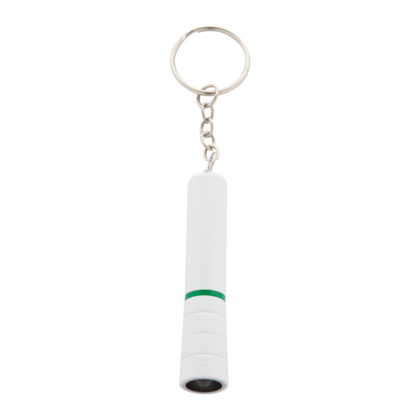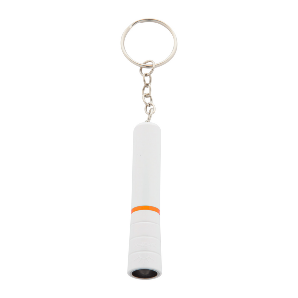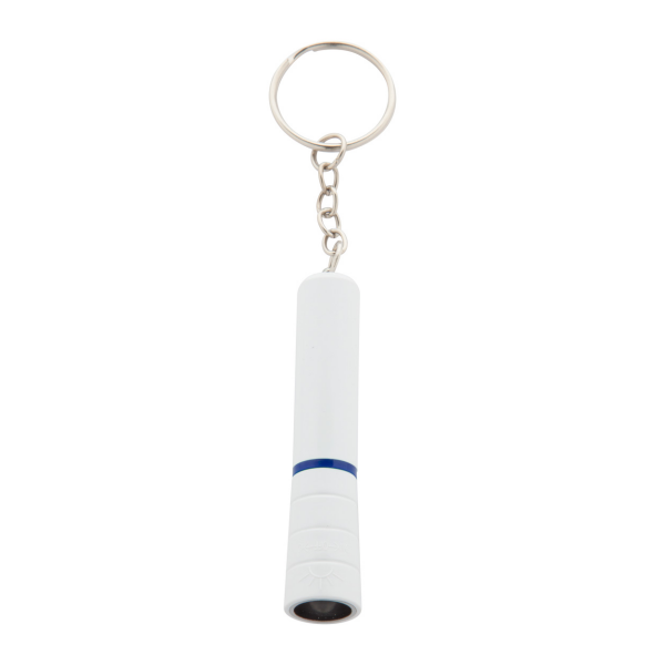 Plastic, mini zaklamp met 1 LED en metalen sleutelhanger. Met knoopcelbatterij.