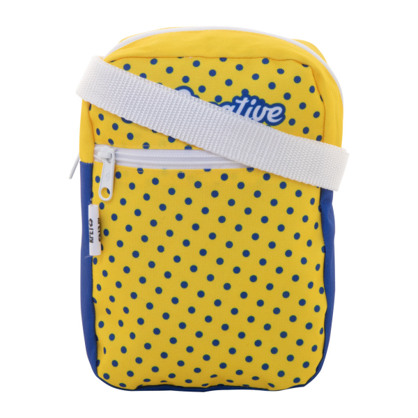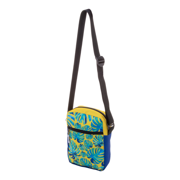 Custom made verticale schoudertas van 600D RPET polyester met ritsvak en voorvak. Met all-over sublimatiebedrukking en onderscheidend RPET-label. MOQ: 25 stuks.