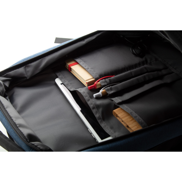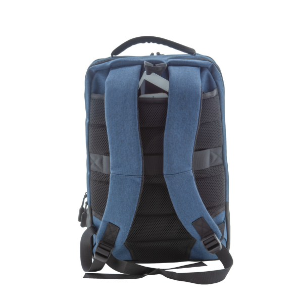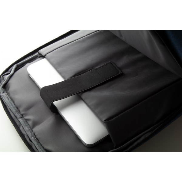 Tweekleurige rugzak met meerdere compartimenten met rits, binnenvakken voor organizers, gevoerd laptopvak (17"), ergonomische rug en schouderbanden. Met antidiefstal trolleyriem en ingebouwde USB-aansluiting voor powerbanks. 400D polyester.