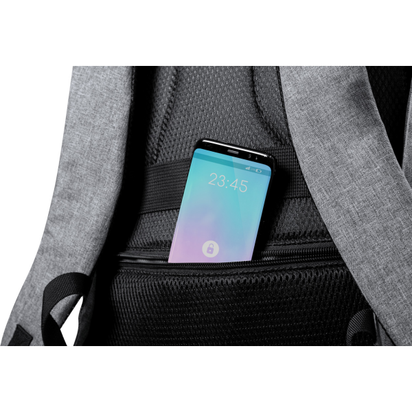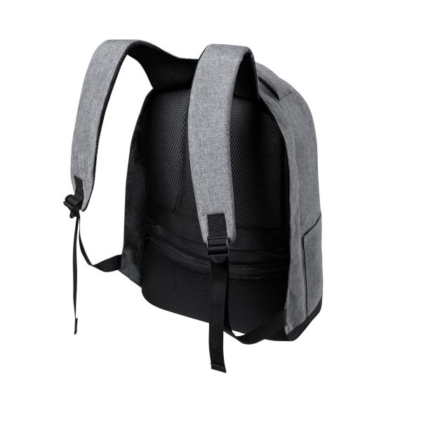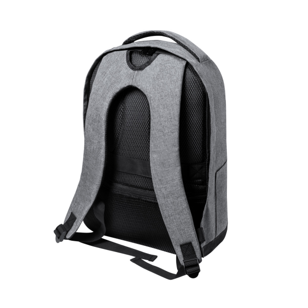 RPET-rugzak met compartimenten met ritssluiting, gewatteerd laptop- (15 ") en tablet- (12") -vak, trolleyriem, ergonomische rug en schouderbanden. Met verborgen antidiefstalvak. 600D RPET polyester.