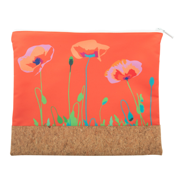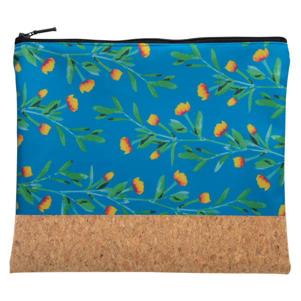 Custom made make-uptas met ritssluiting van polyester en natuurkurk. Met all-over sublimatiedruk. MOQ: 50 stuks.