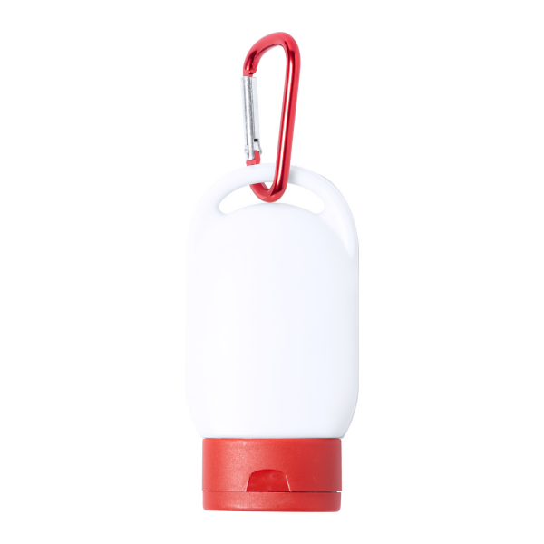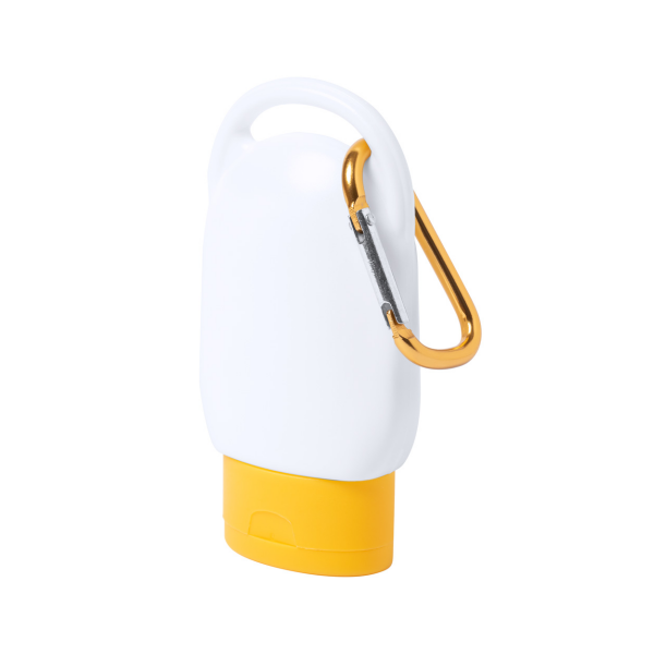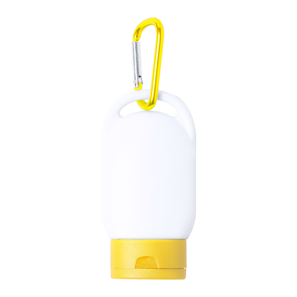 Zonnebrandlotion in plastic container met bijpassende kleur dop en karabijnhaak. SPF30 bescherming, 30 ml.