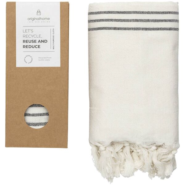 Deze veelzijdige stof is dik genoeg om te gebruiken als plaid of handdoek, dun genoeg om als sjaal te dragen en compact genoeg om overal mee naartoe te nemen. Gemaakt van 100% gerecycled materiaal uit de kledingindustrie in Bangladesh, geweven op een traditioneel handweefgetouw en ondersteunt het ondernemerschap van vrouwen. Een ideaal sociaal cadeau dat bijdraagt aan een duurzaam en maatschappelijk verantwoord doel. Afmetingen: 85 × 175 cm. Samenstelling: 70% gerecycled katoen, 25% gerecycled polyester, 5% andere gerecyclede vezels.