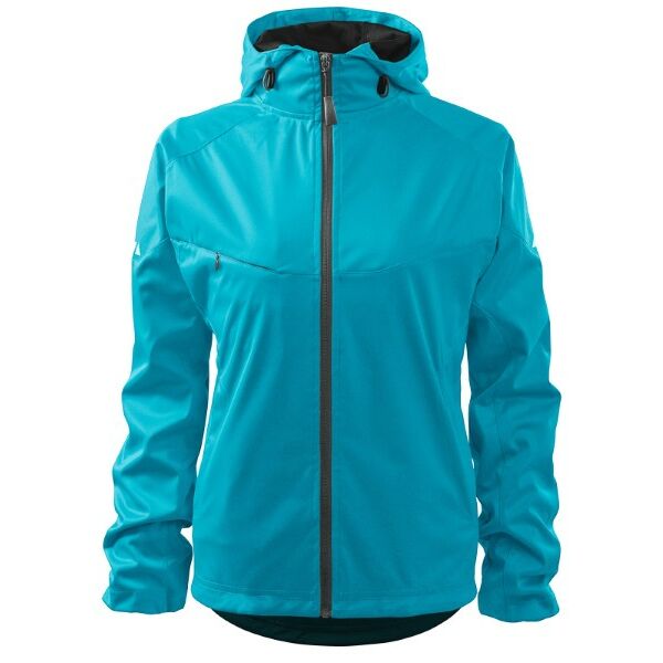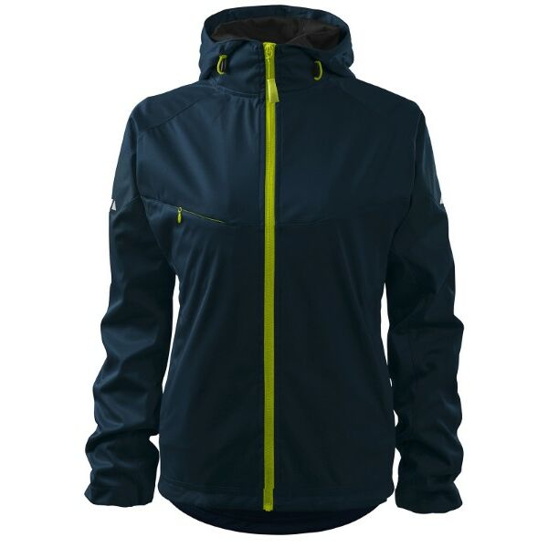 3-layer softshell with membrane, slight fit cut, full-length reverse coil zipper, hood and bottom hem adjustable by elastic drawstring, sleeve hems adjustable by velcro, welt pockets with reverse coil zipper, breast pocket with the zip hidden in the dividing seam, curved and slightly prolonged back part, contrast and reflective elements, Care information for softshell fabric