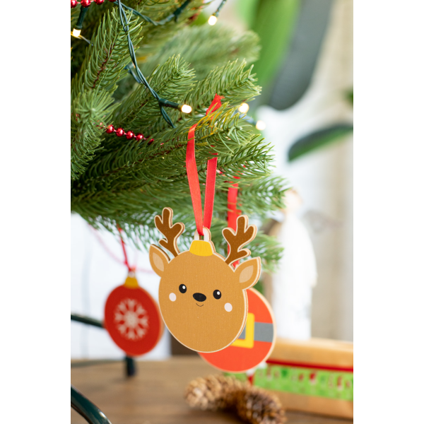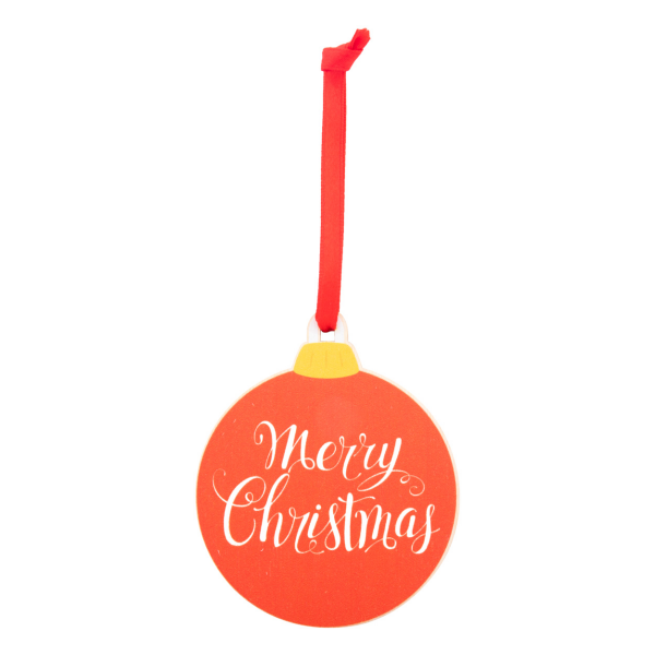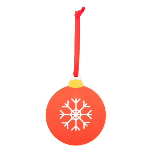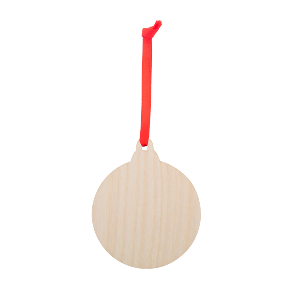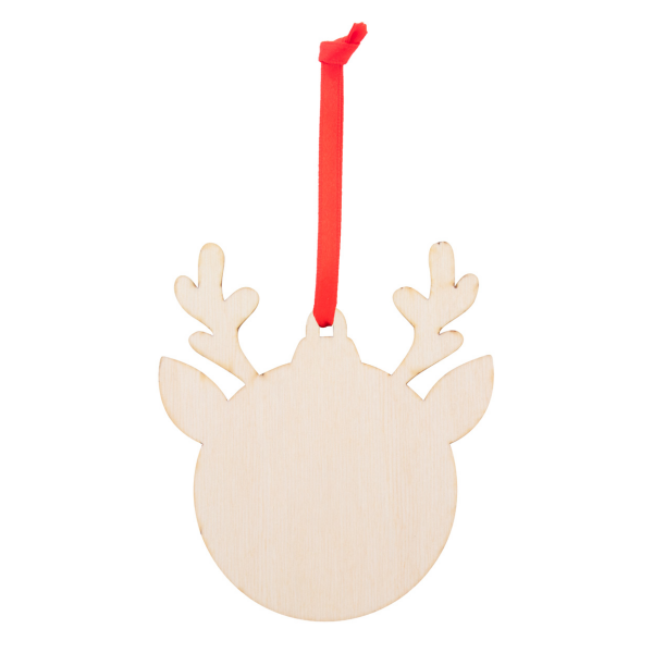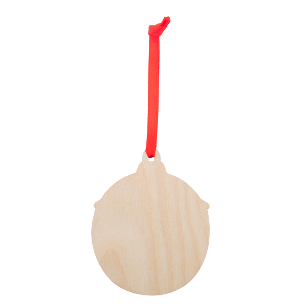 Houten kerstboomversiering van berkenmultiplex, met bedrukt kerstmotief en rood lint. Geleverd met los lint.
