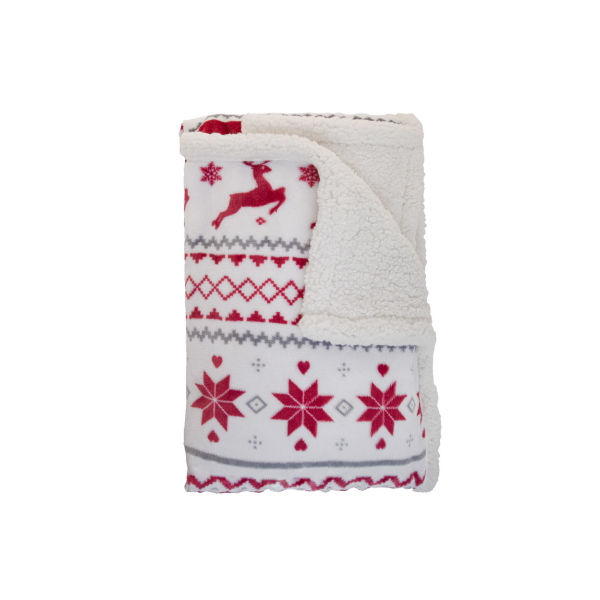 Dubbellaagse RPET Kerst deken met 230 g/m² RPET flanellen fleece en omkeerbare 210 g/m² RPET sherpa fleece voering. Verpakt met lint en bedrukbare papieren kaart.
